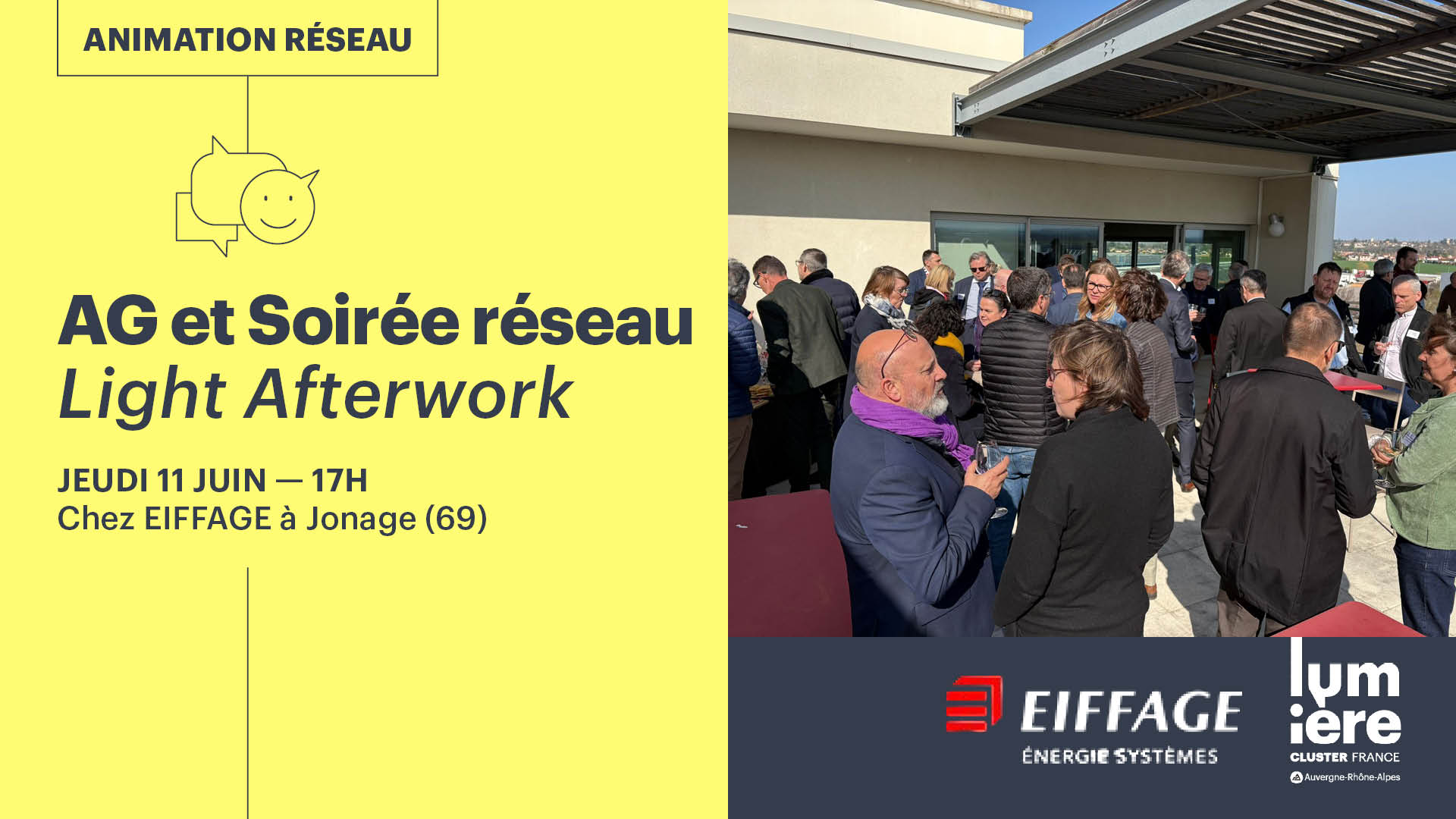 Le Cluster Lumière a le plaisir de vous inviter à participer à son Assemblée Générale 2026 suivie d'une soirée réseau chez son adhérent EIFFAGE ENERGIE SYSTEMES à Jonage, le jeudi 11 juin.