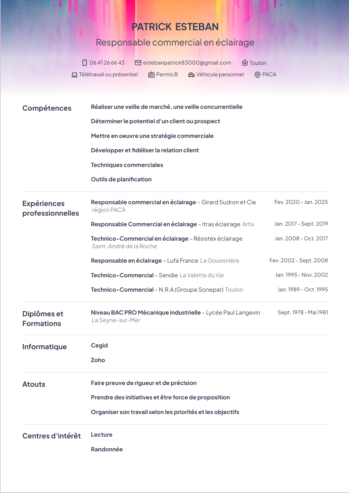 Patrick Esteban recherche actuellement une nouvelle opportunité professionnelle dans l’éclairage, pour un poste en présentiel ou en distanciel. Profil Linkedin : Patrick Esteban CV joint. Document(s) lié(s) à cette annonce CV_Patrick Esteban Les marchés liés à cette annonce d'emploi Commerces